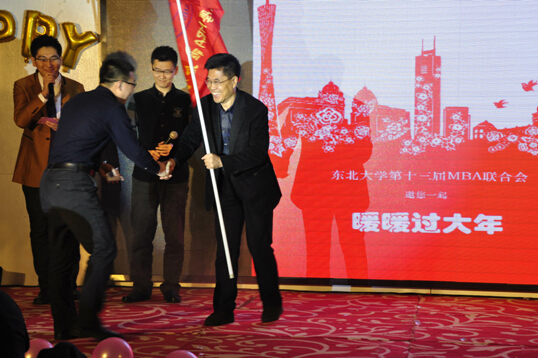 精彩的舞蹈结束后,进行了东北大学MBA联合会会旗交接仪式。第十二届MBA联合会主席胡庆贺手持会旗率先登台,对去年联合会所开展的一些工作进行了总结。随后,郝树满书记从胡庆贺手中接过会旗,并对联合会的工作进行了肯定与展望。最后郝书记将会旗交到第十三届MBA联合会主席刘丰手中,刘丰同学表示一定紧密团结在工商管理学院周围,支持MBA中心工作,服务同学,将MBA联合会越做越好。