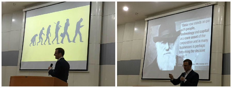 第二部分,Mr. Hauk以数字达尔文理论为指引,指出社会、科技推动着人类行为、预期以及习惯的改变,并用人类行走姿态、10年间同一地点但不同状态的图片说明科技给人类行为带来的改变,并对比了如何能够将信息传递至500万用户的时间长短,从电话机时代的75年、广播时代的38年、电视时代的13年到现在数字时代的12天。这些都说明现今数据量已经与人类持平,技术和资本已经成为公司的核心价值或者说正逐渐成为决定性价值。随着计算机技术的不断发展,数据的更新速度越来越快,预测2020年世界范围的数据总量将达到50万亿,大数据时代已经到来。在这样的时代背景下,Mr. Hauk进一步分析了数据对平台、生态系统、文化的影响力,并特别描绘了中国数据量指数化增长、独具特色的数据概况、科研投资总量变化,以及创新集群分布,指出中国的数据变革速度呈现“变形”趋势。最后得出结论:数据是价值产生的新驱动力,一切能够数据化的都已经成为数据,文化的创新是基于快速的衰落和学习。