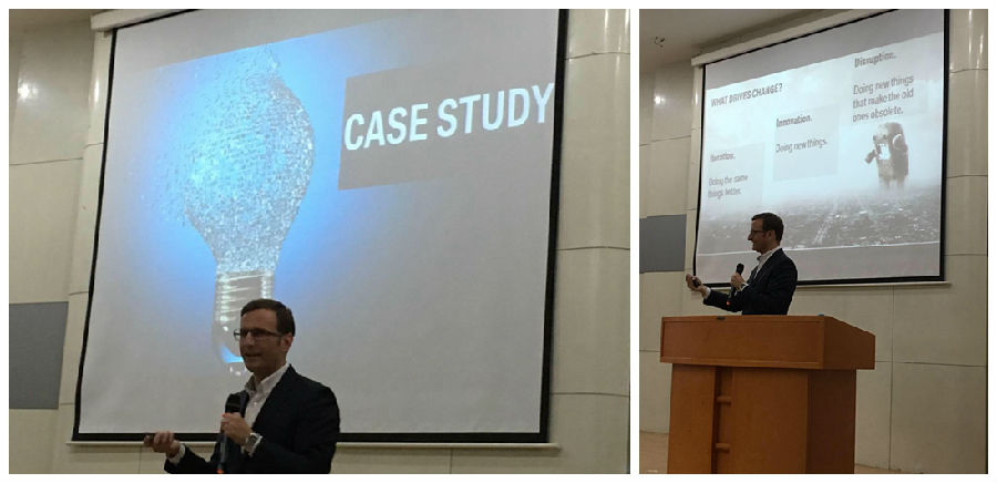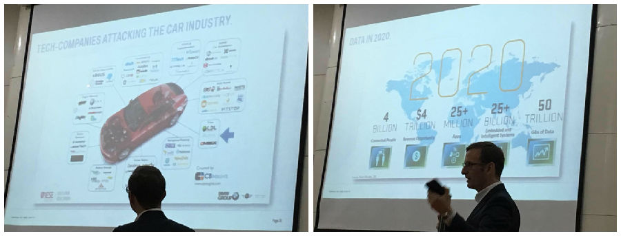 第一部分,Mr. Hauk提出是什么创造了机会?并给出答案,即将同一事物做到更好的迭代、创造新事物的革新,以及利用新事物替代旧事物的瓦解,并在展示了大量图文并茂的事例、顾能公司技术成熟度曲线、2016年制造业技术成熟度曲线之后,提出到底需要多久能够确立一项新科技,指出现今的公司生命周期正在不断缩短的现状。之后在案例分析环节,放映了乔布斯在苹果手机发布会向世人介绍iphone时激动人心的演讲,以时间为轴对比了苹果、诺基亚和黑莓销量数据说明科技为产业革新带来的力量。接着,Mr. Hauk指出科技公司对汽车工业的影响正逐步扩大到各个环节,并用资本市场的价值导向图表以及在其他行业领域由瓦解带来的变革得出结论:瓦解带来机会,未来的科技已被今日所晓,不要担忧、拥抱机会。