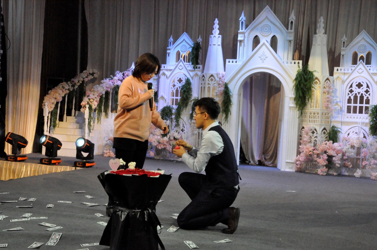 在晚会的最后,还有终极彩蛋出现!主持人郭文琦借晚会的平台向心爱的姑娘求婚成功,有情人终成眷属,让2019届的同学们见证了惊喜而甜蜜的一刻,给2019届年会现场和在场的所有同学洒下了阳光普照牌的狗粮,留下了深刻难忘的印象。