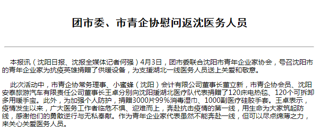 4月3日,小蜜蜂团支部响应团市委、市青协号召,向沈阳援湖北医疗队代表送去慰问品和防护用品(120床电热毯、120个可拆卸多用暖手宝、3000片99%消毒湿巾、1000副医疗硅胶手套),向逆行者们表达关爱与敬意,感恩他们的勇敢逆行与无私奉献。(此新闻发表于2020年4月7日《沈阳日报》第7版)