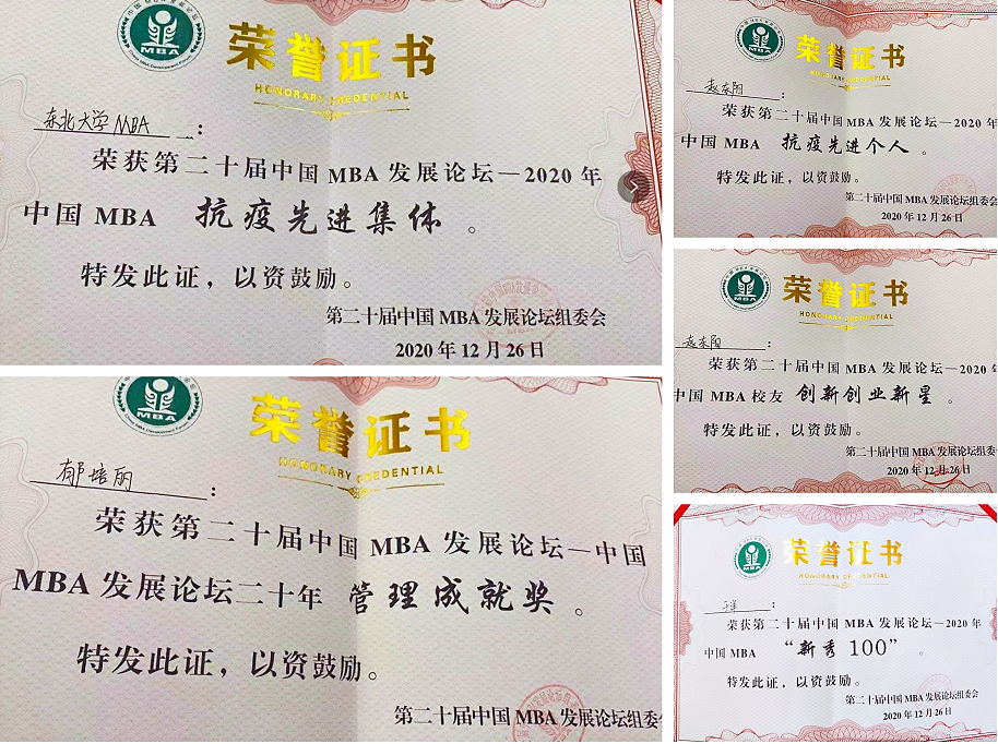 在本届论坛上,东北大学MBA教育项目荣获多个奖项:东北大学MBA获“中国MBA先进抗疫集体”,东北大学工商管理学院副院长郁培丽教授获“中国MBA发展论坛二十年管理成就奖”,东北大学第十七届MBA联合会主席赵东阳获“中国MBA抗疫先进个人”、“中国MBA校友创新创业新星”,东北大学第十七届MBA联合会宣传部长于洋获“中国MBA新秀100”。