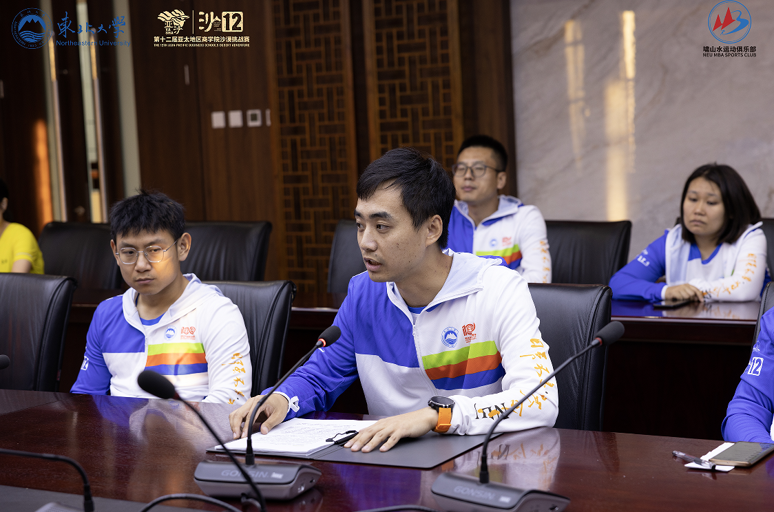 接下来,东北大学MBA沙12代表队队长高明志就赛事策略安排及营地后勤安排进行了详细阐述。东北大学啸山水俱乐部组织者、沙11代表队队长何欣介绍了参赛经验及俱乐部期许。