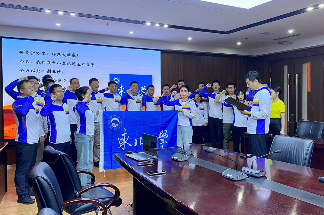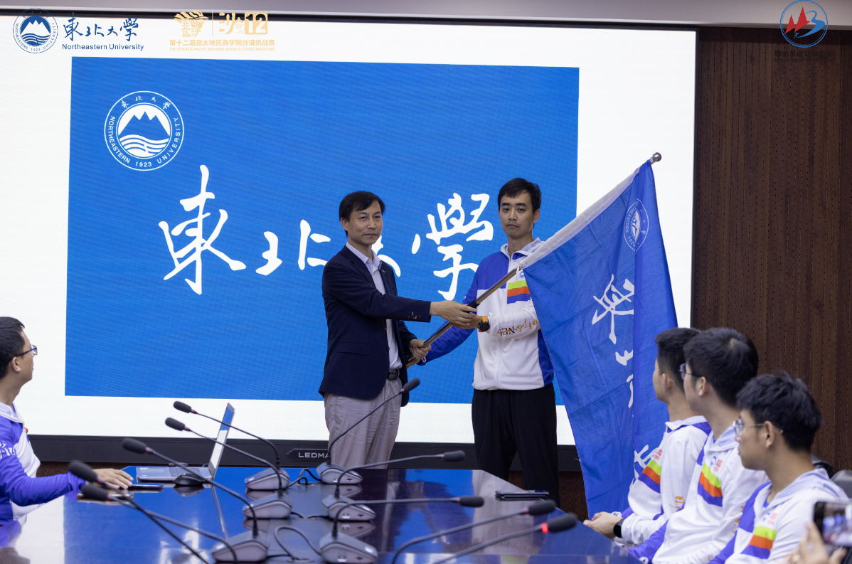 在全体东北大学MBA沙12代表队队员的见证下,王世权主任将东北大学旗帜授予队长高明志。全体队员庄严宣誓,将全力以赴冲刺亚沙,风雨同舟,齐心协力,安全完赛,不辱使命,力争为母校增光,为东大百年校庆献礼。