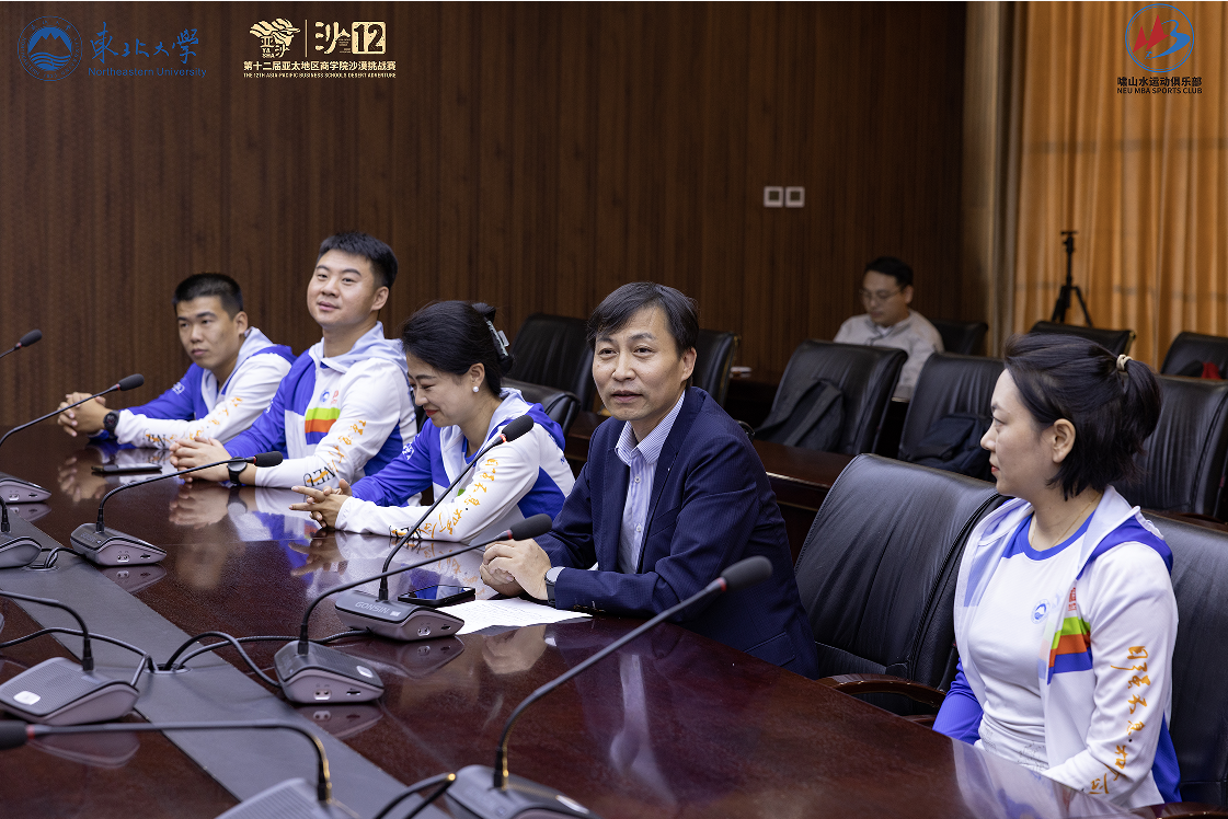 仪式首先由王世权主任致辞。王主任肯定了东北大学MBA沙12代表队为参加赛事所付出的辛苦和努力,队员们团结一心,刻苦训练,充分体现了东北大学MBA学子的韧性和坚持。王主任勉励全体队员秉承“自强不息,知行合一”的校训精神,值百年校庆之际,努力争取优异成绩,为学校增光添彩。