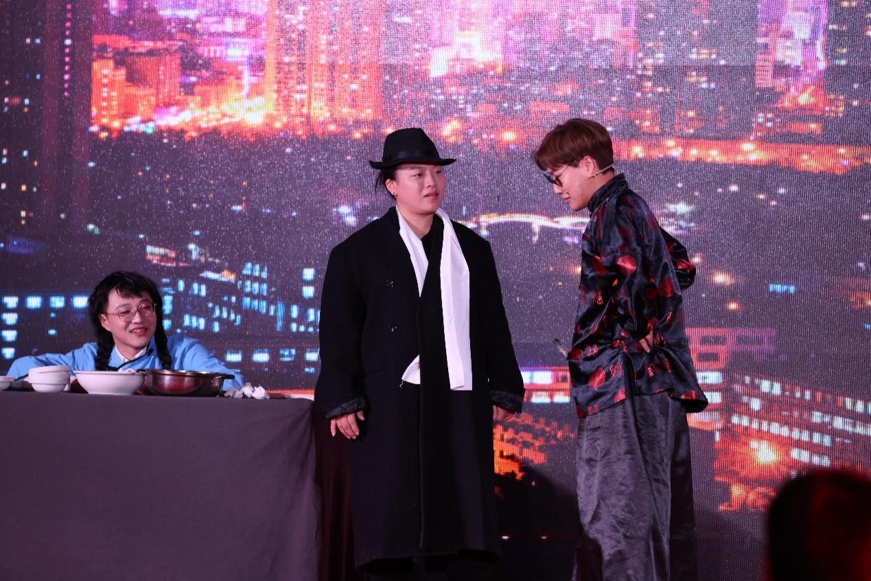 马乐同学带来的歌曲《夜上海》在舞台上响起,唤起了同学们对那个时代的记忆,随着音乐的节奏,感受着那个年代的热情与活力,现场掌声不断;周诗博、石家成、藏舸含、张弛、刘佳璇、王冬雪、吴洋洋、张骞予、代宗生、梁旭、王止睿、段嘉兴等同学带来小品《东大外滩》,幽默风趣的表演再现上海滩的经典场景,笑点频频,将晚会推向高潮。