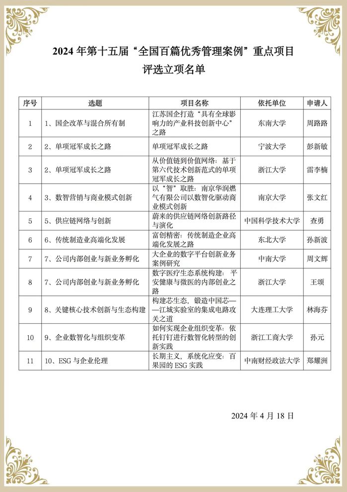 据悉,自《第十五届“全国百篇优秀管理案例”评选重点项目申报指南》于2023年12月发布以来,共收到来自33所院校的立项申请书44份,经过初审及重点项目专家委员会函审,共有16份申请书进入立项答辩环节,最终,11份立项申请获批。