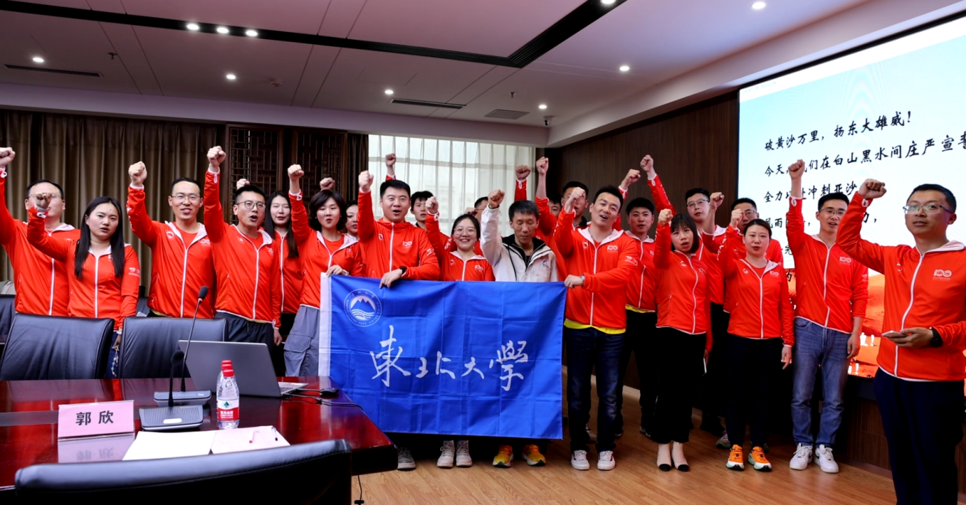 仪式最后,东北大学沙十三代表队队长李雪山同学带领全体东北大学沙十三队员庄严宣誓,将全力以赴冲刺亚沙,风雨同舟,齐心协力,安全完赛,不辱使命,力争为母校增光,续写东大金沙鸥辉煌!