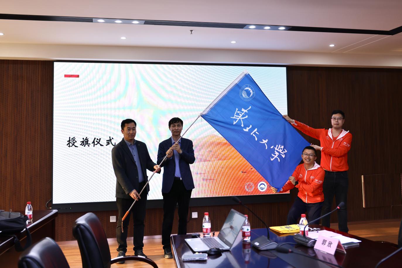 随后进行了授旗仪式。东北大学工商管理学院副院长王世权教授、研究生培养办公室主任胡志远共同向东北大学沙十三代表队队长李雪山同学、副队长高晨峰同学授予东北大学旗帜。
