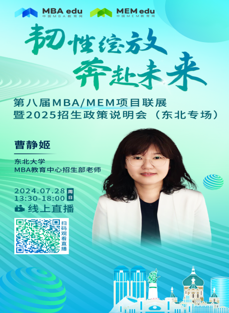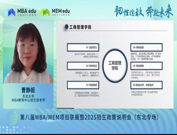 作者: 更新日期:2024-07-302024年7月28日,由中国MBA教育网主办的第八届MBA/MEM项目联展暨2025年招生政策发布会(东北专场)以线上形式成功举行,共同探索东北地区MBA/MEM项目的优质资源和最新招生动态。东北大学作为东北地区MBA教育项目知名培养院校之一参与了本次招生政策发布会。线上参与考生人数达到2000余人。