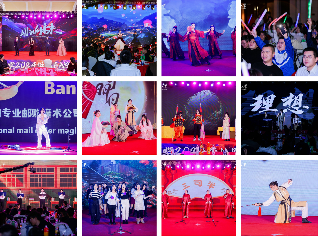 穿插其间的多轮抽奖环节点燃了观众热情,同学们踊跃互动,现场气氛热烈。晚会尾声,第二十二届MBA联合会全体成员合唱《相亲相爱一家人》,温情旋律令全场动容。尽管晚会持续至深夜22时,师生们仍沉浸于欢乐氛围中,久久不愿离场。