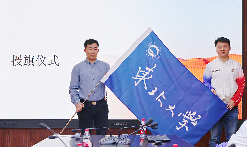 随后,在全体沙十四队员的见证下,胡志远主任将东北大学旗帜正式授予沙十四队长宋先峰。